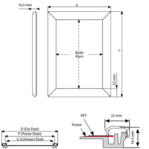 Ürün paketli olarak sevk edilmektedir. 32 mm profilli çerçevelere 16 mm harf yüksekliğinde baskı yapılabilir.