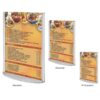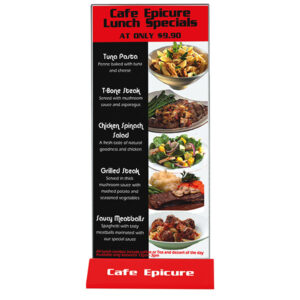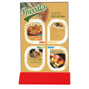 Piramit menü tutucu plastik enjeksiyon taban ve akrilik üst olarak 2 parçadan oluşur. Kırmızı ve siyah taban rengi seçeneği sunar. Tabana baskı yapılabilecek 35 mm alana sahiptir. Baskı alan genişliği 105 mm ve 150 mm dir. Söz konusu görselinizi akrilik arasına yerleştirdikten sonra tabana yerleştiriniz.
