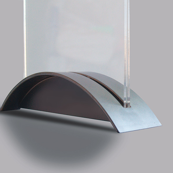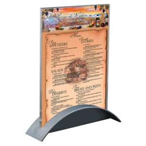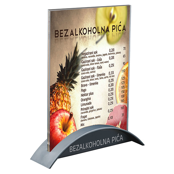 Şık plastik enjeksiyon tabanlı akrilik menülük. Gümüş ve siyah renk seçenekleri ile menü föy gibi masa üstü gereçlerini sergileyebilmeniz için tasarlanmış zarif bir üründür. Plastik tabana logonuzu 22mm harf yüksekliği ile uygulayabilirsiniz