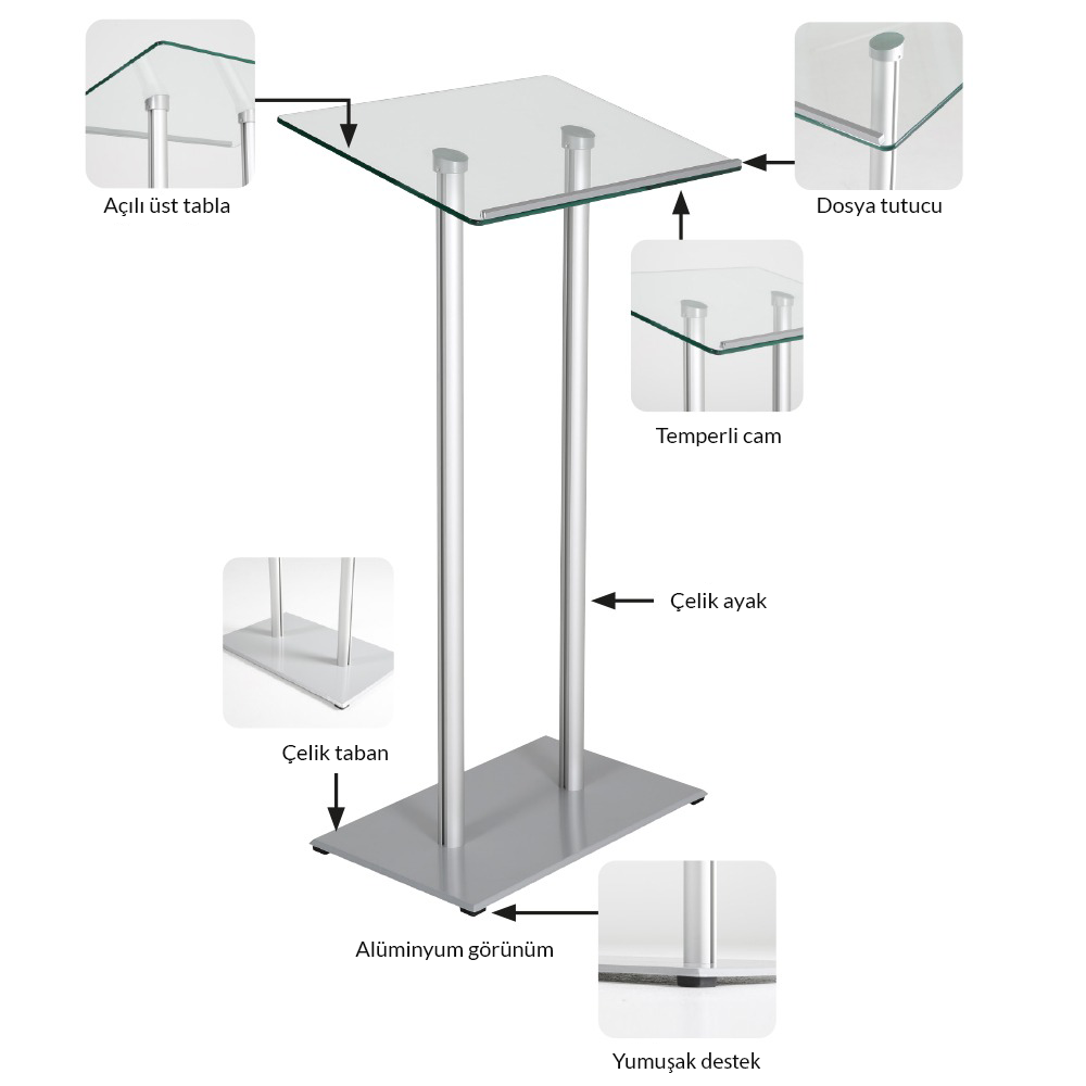 Bu kürsü, sunum yapan kişinin hem özgüvenini artırıyor hem de dinleyiciyle bağ kurmasını kolaylaştırıyor. Üst yüzeyin ferah ve düzenli görünümü, sahnedeki karmaşayı ortadan kaldırıyor. Dosya yerleştirilen bölüm sayesinde konuşmacının elindeki materyaller her an hazır ve derli toplu duruyor. Tabanın dengeli yapısı ise insana güven veren bir sağlamlık hissi oluşturuyor—sahnede “acaba devrilir mi?” gibi bir endişeye yer bırakmıyor.
